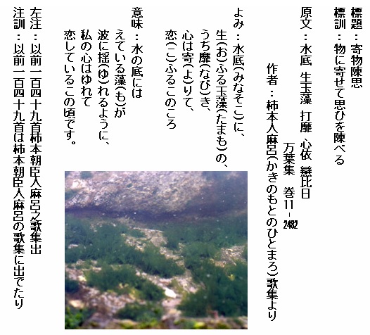 巻11-2482:水底に生ふる玉藻のうち靡き心は寄りて恋ふるこのころ