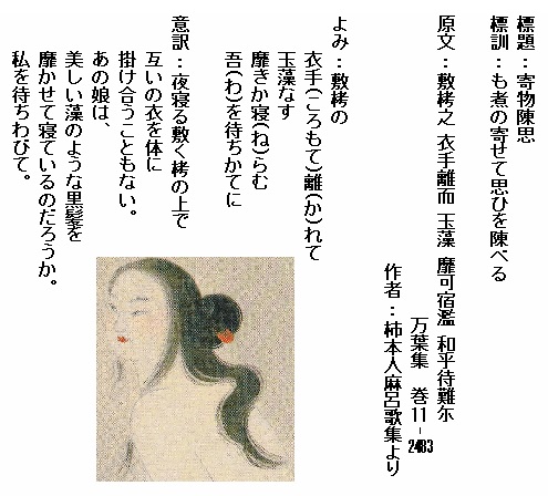 巻11-2483:敷栲の衣手離れて玉藻なす靡きか寝らむ我を待ちかてに