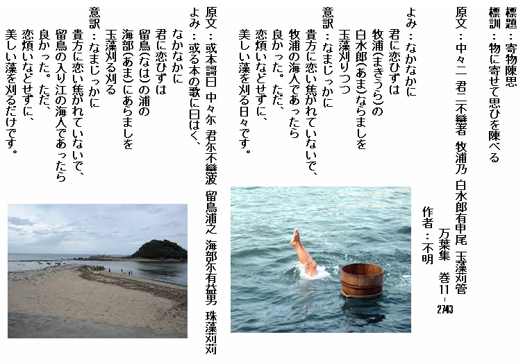 巻11-2743:なかなかに君に恋ひずは比良の浦の海人ならましを玉藻刈りつつ