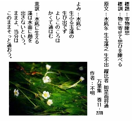 巻11-2778:水底に生ふる玉藻の生ひ出でずよしこのころはかくて通はむ