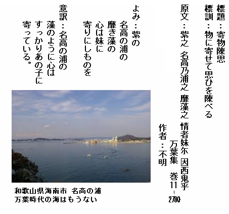 巻11-2780:紫の名高の浦の靡き藻の心は妹に寄りにしものを