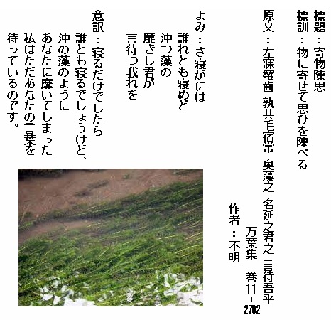 巻11-2782:さ寝がには誰れとも寝めど沖つ藻の靡きし君が言待つ我れを