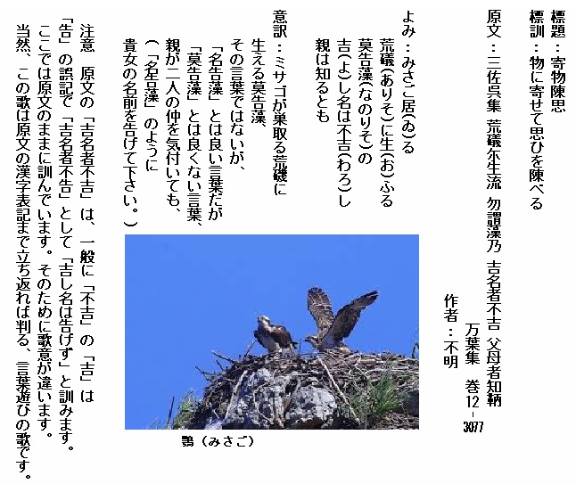 巻12-3077:みさご居る荒礒に生ふるなのりそのよし名は告らじ親は知るとも