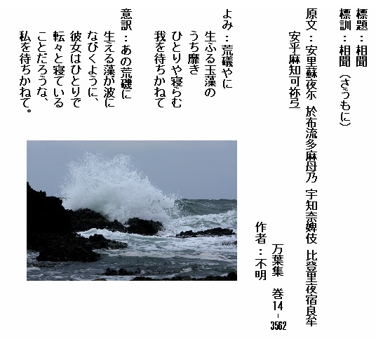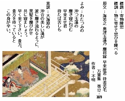 巻12-3079:わたつみの沖つ玉藻の靡き寝む早来ませ君待たば苦しも