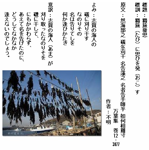 巻12-3177:志賀の海人の礒に刈り干すなのりその名は告りてしを何か逢ひかたき