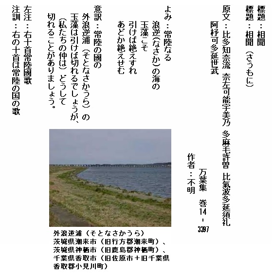 原文:布治奈美波 佐岐弖知理尓伎 宇能波奈波 伊麻曽佐可理等 安之比奇能 夜麻尓毛野尓毛 保登等藝須 奈伎之等与米婆 宇知奈妣久 許己呂毛之努尓 曽己乎之母 宇良胡非之美等 於毛布度知 宇麻宇知牟礼弖 多豆佐波理 伊泥多知美礼婆 伊美豆河泊 美奈刀能須登利 安佐奈藝尓 可多尓安佐里之 思保美弖婆 都麻欲比可波須 等母之伎尓 美都追須疑由伎 之夫多尓能 安利蘇乃佐伎尓 於枳追奈美 余勢久流多麻母 可多与理尓 可都良尓都久理 伊毛我多米 氏尓麻吉母知弖 宇良具波之 布施能美豆宇弥尓 阿麻夫祢尓 麻可治加伊奴吉 之路多倍能 蘇泥布里可邊之 阿登毛比弖 和賀己藝由氣婆 乎布能佐伎 婆奈知利麻我比 奈伎佐尓波 阿之賀毛佐和伎 佐射礼奈美 多知弖毛為弖母 己藝米具利 美礼登母安可受 安伎佐良婆 毛美知能等伎尓 波流佐良婆 波奈能佐可利尓 可毛加久母 伎美我麻尓麻等 可久之許曽 美母安吉良米々 多由流比安良米也