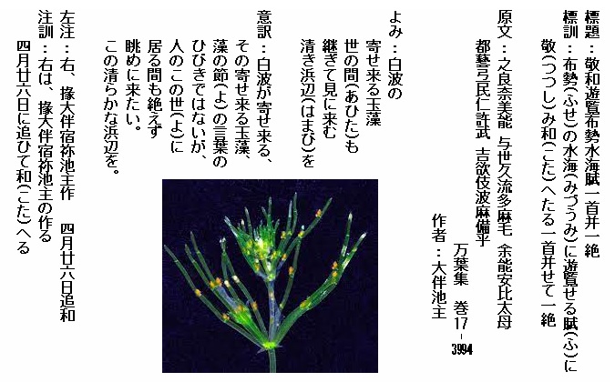 巻17-3994:白波の寄せ来る玉藻世の間も継ぎて見に来む清き浜びを