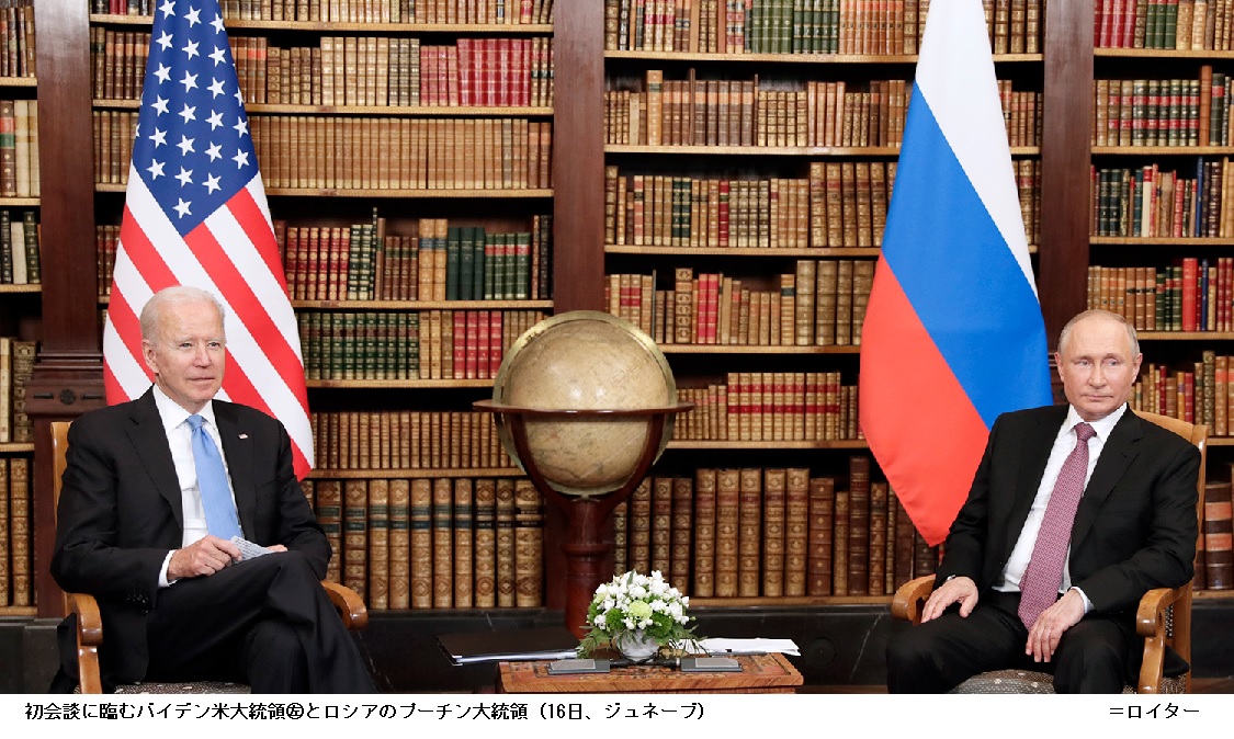 米ロ首脳が初会談 核軍縮や気候変動で協力探る ―― バイデン米大統領とロシアのプーチン大統領は16日午後(日本時間同日夜)、ジュネーブで初めて会談した。核兵器を柱とする軍縮や気候変動などで協力を探る。米ロ関係は冷戦後最悪の水準にあり、会談の結果は国際情勢に多大な影響を及ぼす。