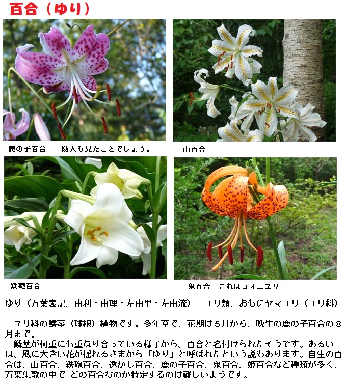 ユリ科ユリ属の多年草の百合(ゆり)です。大きい花が風に揺れ動くことからついた名だということです。山百合、鉄砲百合、透かし百合、鹿の子百合、鬼百合、姫百合など種類が多く、万葉集歌の中での特定は難しいと言われています。