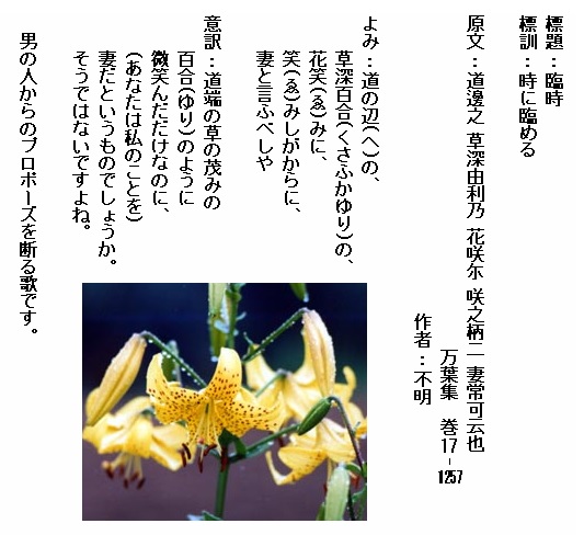 巻7-1257:道の辺の草深百合の花笑みに笑みしがからに妻と言ふべしや