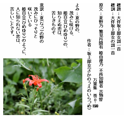 巻8-1500:夏の野の茂みに咲ける姫百合の知らえぬ恋は苦しきものぞ