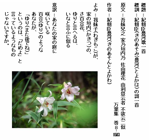 巻8-1503:我妹子が家の垣内のさ百合花ゆりと言へるはいなと言ふに似る