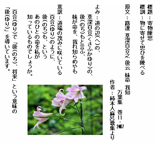 巻11-2467:道の辺の草深百合の後もと言ふ妹が命を我れ知らめやも