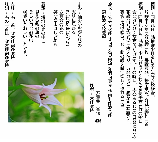 巻18-4087:灯火の光りに見ゆるさ百合花ゆりも逢はむと思ひそめてき