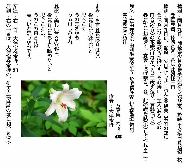 よみ:大王(おほきみ)の 遠(とほ)の朝廷(みかど)と 任(ま)き給(たま)ふ 官(つかさ)のまにま み雪降る 越に下り来 あらたまの 年の五年(いつとせ) 敷栲の 手枕(たまくら)まかず 紐解かず 丸寝(まろね)をすれば いぶせみと 情(こころ)慰(なぐ)に なでしこを 屋戸(やと)にまをほし 夏の野し さ百合引き植ゑて 咲く花を 出で見るごとに なでしこが その花妻(はなつま)に さ百合花(ゆりはな) 後(ゆり)も逢はむと 慰むる 心し無くは 天離る 鄙に一日(ひとひ)も あるべくもあれや
