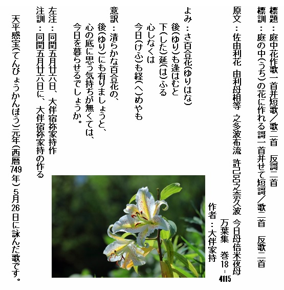 巻18-4115:さ百合花ゆりも逢はむと下延ふる心しなくは今日も経めやも