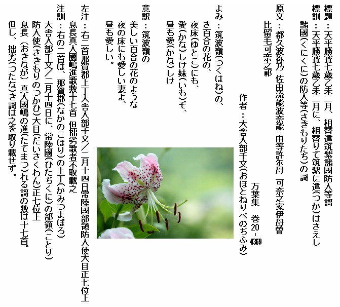 巻20-4369:筑波嶺のさ百合の花の夜床にも愛しけ妹ぞ昼も愛しけ