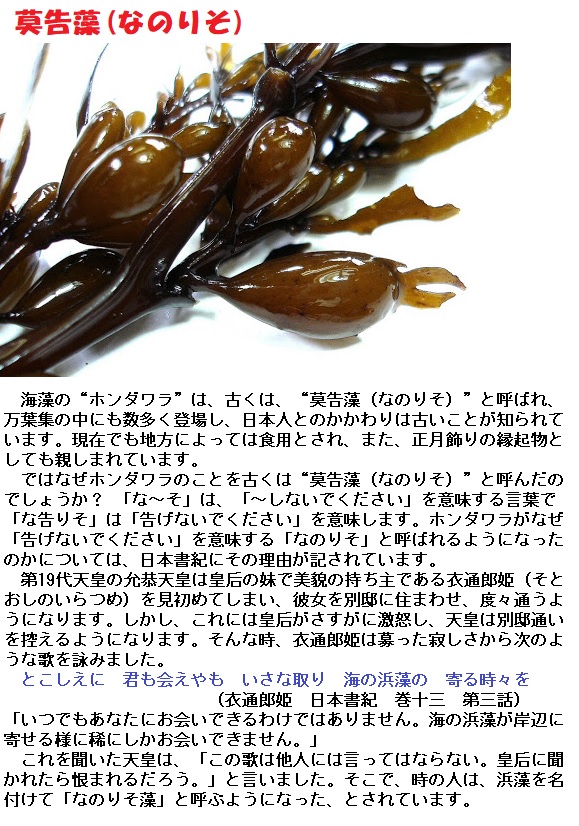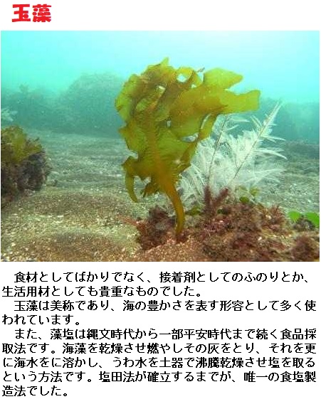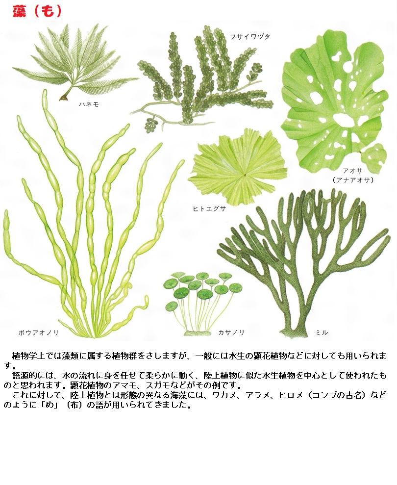 藻は海や淡水の水性植物、たとえば昆布や若布(わかめ)などの総称です。古くは藻葉などと言われたそうです。海藻類は、塩焼き、食用として使われていました。海藻類にはミネラル(鉄やカルシウムなど)・ビタミンAが豊富に含まれているので当時の健康食品としては最適だったのでしょうね。