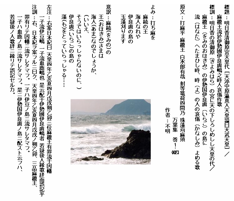 巻1‐0023: 打ち麻を麻続の王海人なれや伊良虞の島の玉藻刈ります