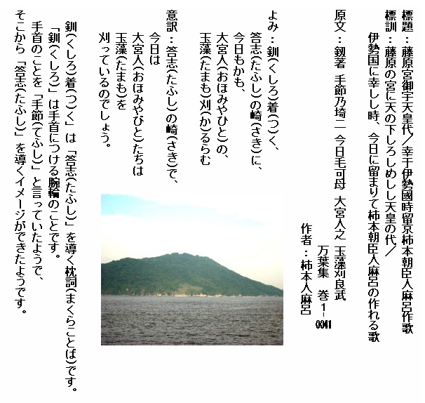巻1‐0041: 釧着く答志の崎に今日もかも大宮人の玉藻刈るらむ