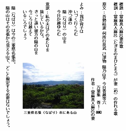 巻1‐0043: 我が背子はいづく行くらむ沖つ藻の名張の山を今日か越ゆらむ