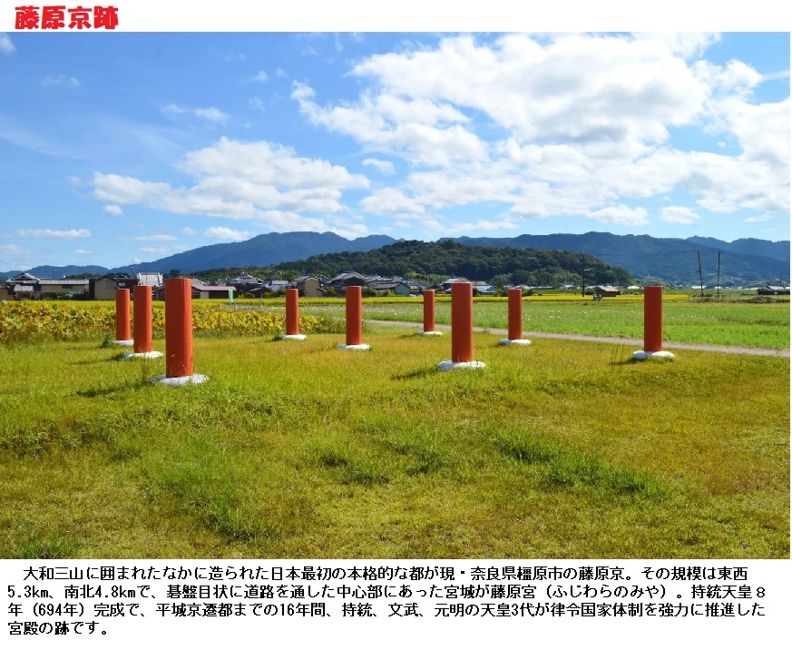 注訓:右、日本紀ニ曰ク、朱鳥七年癸巳秋八月、藤原ノ宮地ニ幸ス。八年甲午春正月、藤原宮ニ幸ス。冬十二月庚戌ノ朔乙卯、藤原宮ニ遷リ居ス。◎滋賀県の田上山(たなかみやま)で伐採(ばっさい)した木材を筏(いかだ)に組んで、琵琶湖から宇治川へ、そして木津川へ運んだのですね。そして木津からは陸路など(運河も造られたとの事です)で藤原の地へ運ばれたようです。