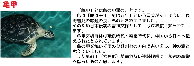 ◎亀(かめ)の甲羅(こうら)の六角形の模様は吉兆(きっちょう:良いことの知らせ)を示すと考えられてきました。