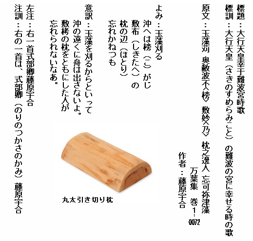 よみ:やすみしし、我(わ)が大君(おほきみ)、高(たか)照(て)らす、日の皇子(みこ)、荒栲(あらたへ)の、藤原(ふぢはら)が上(うへ)に、食(を)す国を、見したまはむと、みあらかは、高(たか)知(し)らさむと、神(かむ)ながら、思(おも)ほすなへに、天地(あめつち)も、寄(よ)りてあれこそ、石走(いはばし)る、近江(あふみ)の国の、衣手(ころもで)の、田上山(たなかみやま)の、真木(まき)さく、桧(ひ)のつまでを、もののふの、八十宇治川(やそうぢがは)に、玉藻(たまも)なす、浮(う)かべ流(なが)せれ、其(そ)を取ると、騒(さわ)く御民(みたみ)も、家(いへ)忘(わす)れ、身もたな知らず、鴨(かも)じもの、水に浮(う)き居(ゐ)て、我(わ)が作る、日の御門(みかど)に、知らぬ国、寄(よ)し巨勢道(こせぢ)より、我が国は、常世(とこよ)にならむ、図(あや)負(お)へる、くすしき亀(かめ)も、新代(あらたよ)と、泉(いづみ)の川に、持ち越せる、真木(まき)のつまでを、百(もも)足(た)らず、筏(いかだ)に作り、泝(のぼ)すらむ、いそはく見れば、神(かむ)ながらにあらし