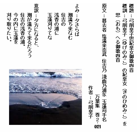 巻2-0121: 夕さらば潮満ち来なむ住吉の浅香の浦に玉藻刈りてな