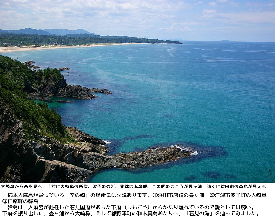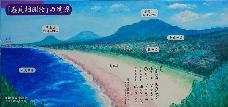 原文:石見之海 津乃浦乎無美 浦無跡 人社見良米 滷無跡 人社見良目 吉咲八師 浦者雖無 縦恵夜思 潟者雖無 勇魚取 海邊乎指而 柔田津乃 荒礒之上尓 蚊青生 玉藻息都藻 明来者 浪己曽来依 夕去者 風己曽来依 浪之共 彼依此依 玉藻成 靡吾宿之 敷妙之 妹之手本乎 露霜乃 置而之来者 此道之 八十隈毎 萬段 顧雖為 弥遠尓 里放来奴 益高尓 山毛超来奴 早敷屋師 吾嬬乃兒我 夏草乃 思志萎而 将嘆 角里将見 靡此山
