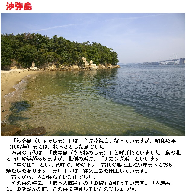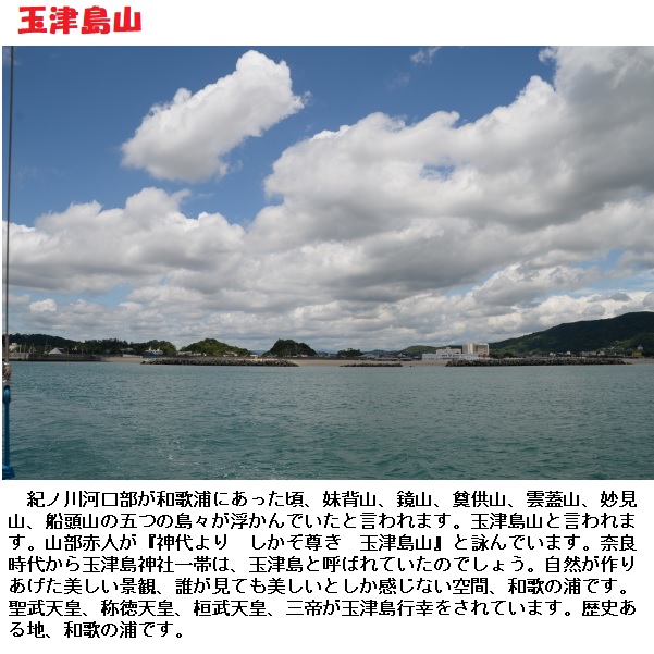 歌の内容は典型的な儀礼歌で、まず天皇を讃え、その永遠の宮である雑賀野から背後に見える沖の島…と、行幸先の宮から見える玉津島の島々のことを詠っています。「雑賀野(さひがの)」は和歌山市西、雑賀崎の野で、このあたりに玉津島の宮があったのでしょう。