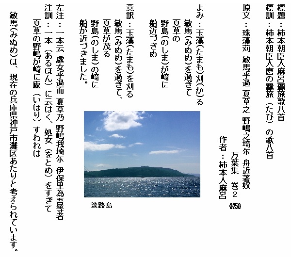 巻6-0946:御食向ふ淡路の島に直向ふ敏馬の浦の.......(長歌)
