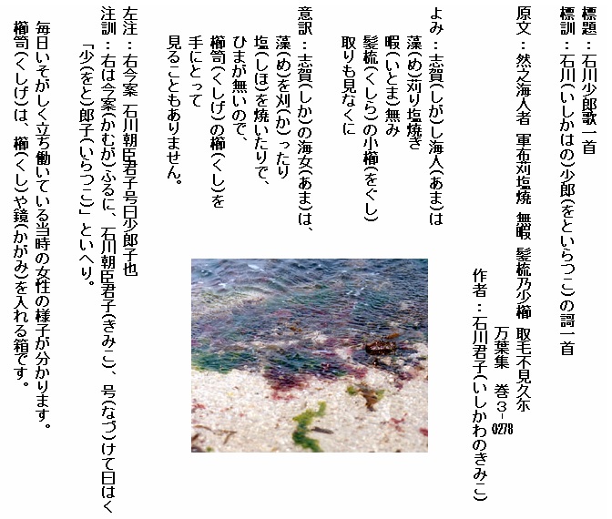 原文:御食向 淡路乃嶋二 直向 三犬女乃浦能 奥部庭 深海松採 浦廻庭 名告藻苅 深見流乃 見巻欲跡 莫告藻之 己名惜三 間使裳 不遣而吾者 生友奈重二
