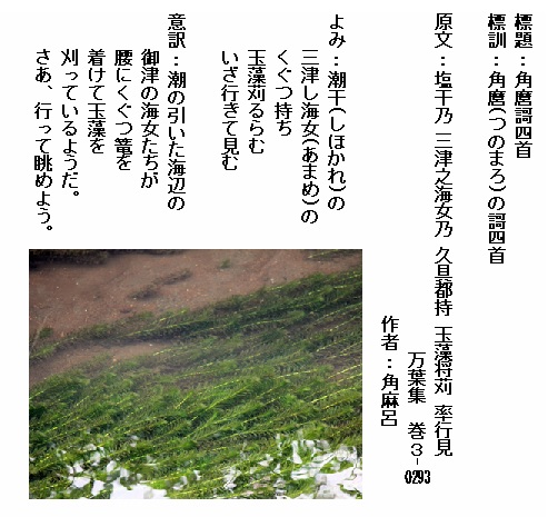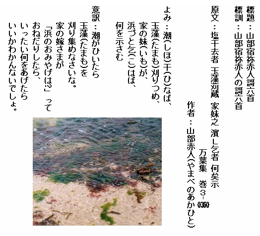 原文:安見知之 和期大王之 常宮等 仕奉流 左日鹿野由 背<匕>尓所見 奥嶋 清波瀲尓 風吹者 白浪左和伎 潮干者 玉藻苅管 神代従 然曽尊吉 玉津嶋夜麻