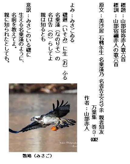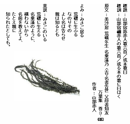よみ:御食向ふ 淡路の島に 直向ふ 敏馬の浦の 沖辺には 深海松採り 浦廻には なのりそ刈る 深海松の 見まく欲しけど なのりその おのが名惜しみ 間使も 遣らずて我れは 生けりともなし
