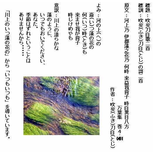 原文:飛鳥 明日香乃河之 上瀬 石橋渡(一云、石浪) 下瀬 打橋渡 石橋(一云、石浪) 生靡留 玉藻毛叙 絶者生流 打橋 生乎為礼流 川藻毛叙 干者波由流 何然毛 吾生乃 立者 玉藻之如許呂 臥者 川藻之如久 靡相之 宣君之 朝宮乎 忘賜哉 夕宮乎 背賜哉 宇都曽臣跡 念之時 春部者 花折挿頭 秋立者 黄葉挿頭 敷妙之 袖携 鏡成 唯見不献 三五月之 益目頬染 所念之 君与時ゞ 幸而 遊賜之 御食向 木瓲之宮乎 常宮跡定賜 味澤相 目辞毛絶奴 然有鴨(一云、所己乎之毛) 綾尓憐 宿兄鳥之 片戀嬬(一云、為乍) 朝鳥(一云、朝霧) 往来為君之 夏草乃 念之萎而 夕星之 彼往此去 大船 猶預不定見者 遺問流 情毛不在 其故 為便知之也 音耳母 名耳毛不絶 天地之 弥遠長久 思将往 御名尓懸世流 明日香河 及万代 早布屋師 吾王乃 形見何此為