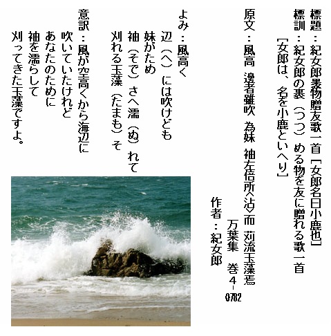 よみ:やすみしし わご大君(おほきみ)の 常宮(とこみや)と 仕へまつれる 雑賀野(さひがの)ゆ 背向(そがひ)に見ゆる 沖つ島 清き渚(なぎさ)に 風吹けば 白波騒(さわ)き 潮干(ふ)れば 玉藻(たまも)刈りつつ 神代より 然(しか)そ尊(たふと)き 玉津島山(たまつしまやま)