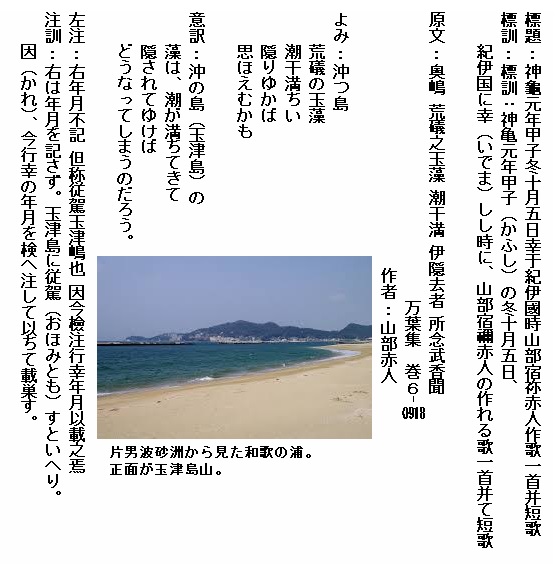 標訓:神亀元年甲子(かふし)の冬十月五日、紀伊国に幸(いでま)しし時に、山部宿禰赤人の作れる歌一首并て短歌