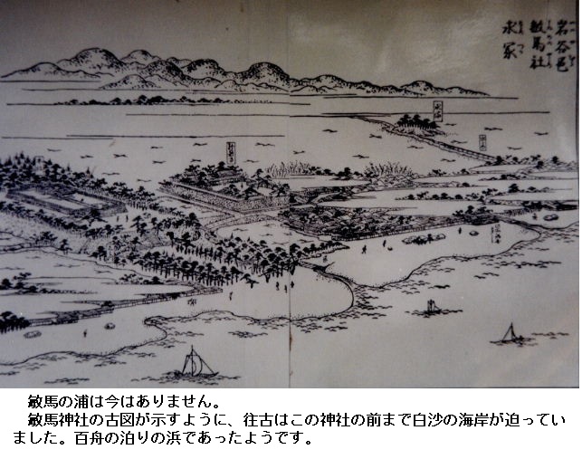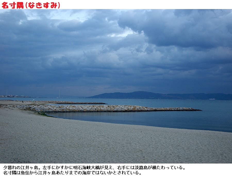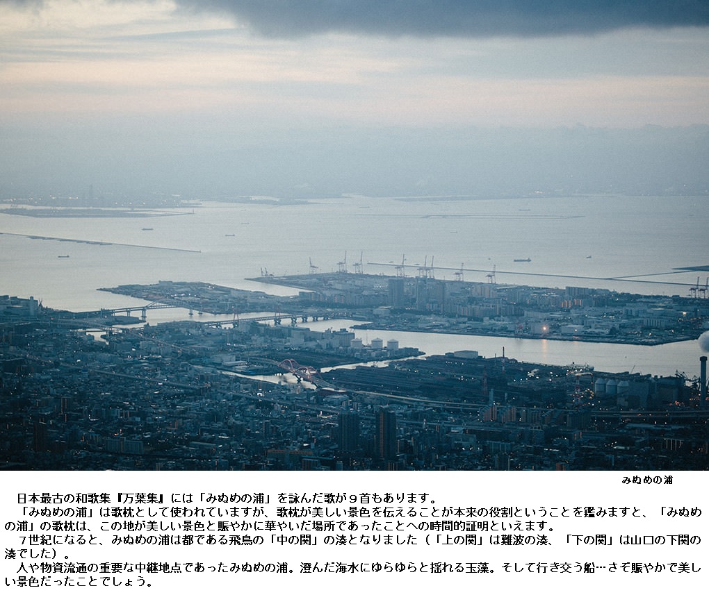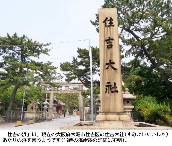意訳:大国主の命の神の御代から多く舟が停泊する所と八島国(日本中)の舟人が定めてきた敏馬の浦。朝風が吹くと波が立ち騒ぎ、夕波時には海藻が寄せてくる。白砂の清らかな浜辺は行きつ戻りつしていつまで眺めていても飽きない。なるほど、見る人見る人が語り継ぎ、なつかしがるわけだ。この先、いついつまでも褒め称えてゆこうではないか。この清らかな白浜を。