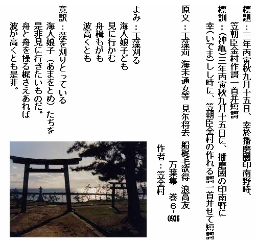 注訓:右は年月を記さず。玉津島に従駕(おほみとも)すといへり。因(かれ)、今行幸の年月を検へ注して以ちて載巣す。