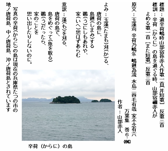 巻6-0943:玉藻刈る唐荷の島に島廻する鵜にしもあれや家思はずあらむ