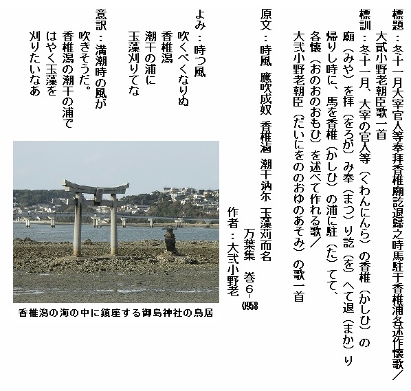 巻6-0958:時つ風吹くべくなりぬ香椎潟潮干の浦に玉藻刈りてな