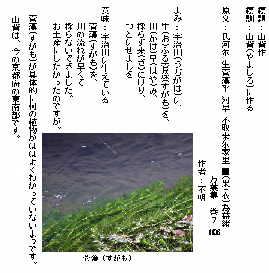 巻7-1136:宇治川に生ふる菅藻を川早み採らず来にけりつとにせましを