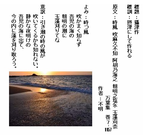 巻7-1157:時つ風吹かまく知らず吾児の海の朝明の潮に玉藻刈りてな