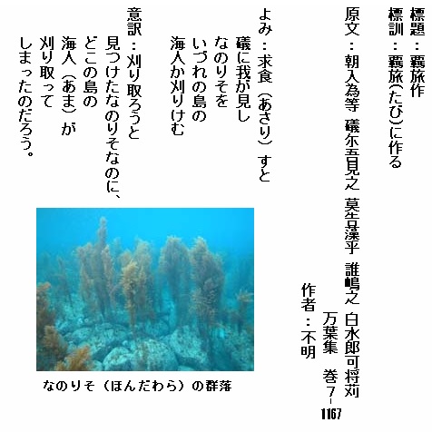 巻7-1167:あさりすと礒に我が見しなのりそをいづれの島の海人か刈りけむ