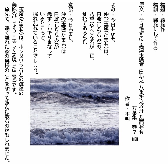 巻7-1168:今日もかも沖つ玉藻は白波の八重をるが上に乱れてあるらむ