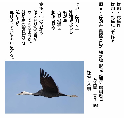 巻7-1199:藻刈り舟沖漕ぎ来らし妹が島形見の浦に鶴翔る見ゆ
