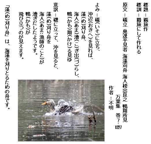 巻7-1227:礒に立ち沖辺を見れば藻刈り舟海人漕ぎ出らし鴨翔る見ゆ