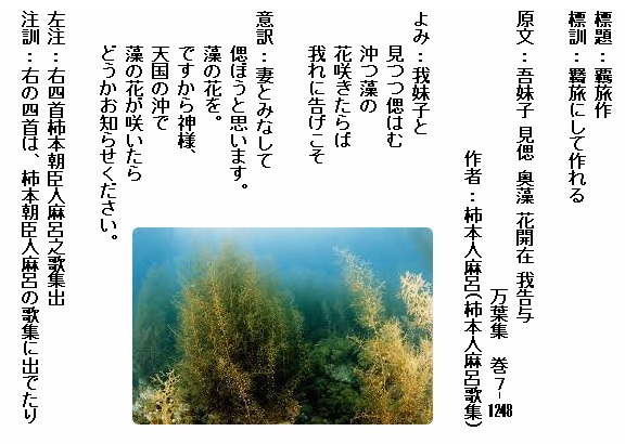 巻7-1248:我妹子と見つつ偲はむ沖つ藻の花咲きたらば我れに告げこそ
