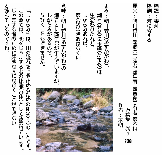 巻7-1380:明日香川瀬々に玉藻は生ひたれどしがらみあれば靡きあはなくに
